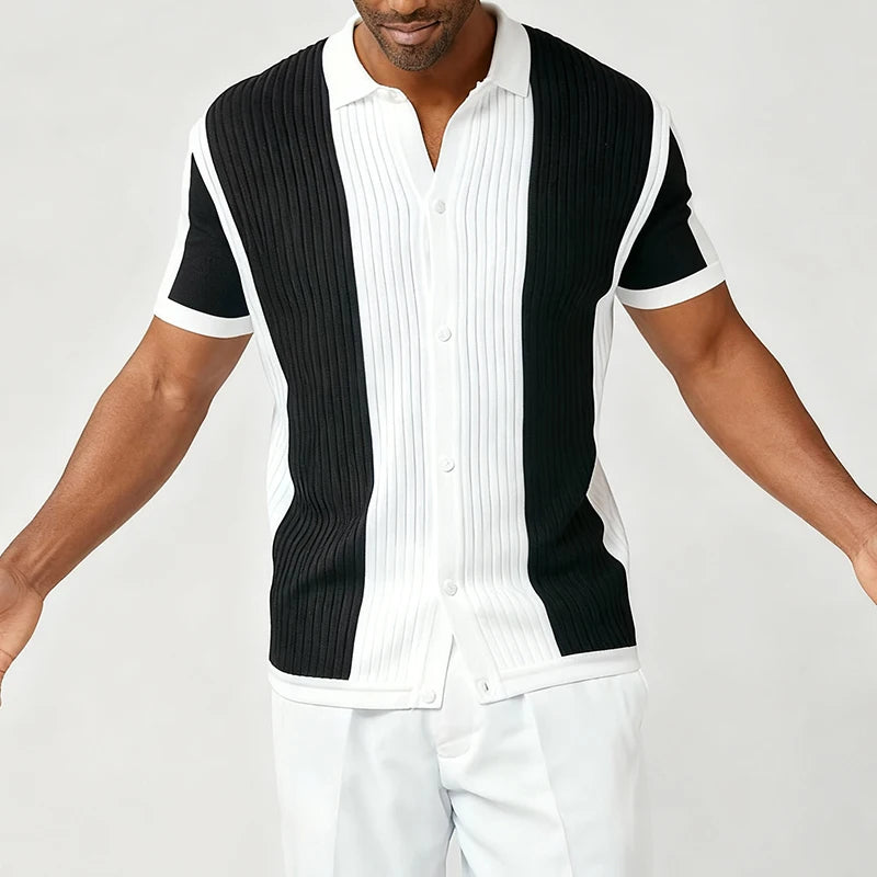 Palazzo is constructed from a fine-gauge polyester rib knit that moves with the body while holding a precise, tailored silhouette through the chest and shoulders. The vertical two-tone panel construction creates a bold graphic presence without relying on print or pattern — structure doing the work of design. A full button placket, contrast-tipped collar, and clean cuff trim place this firmly between resort wear and sharp casual dressing.